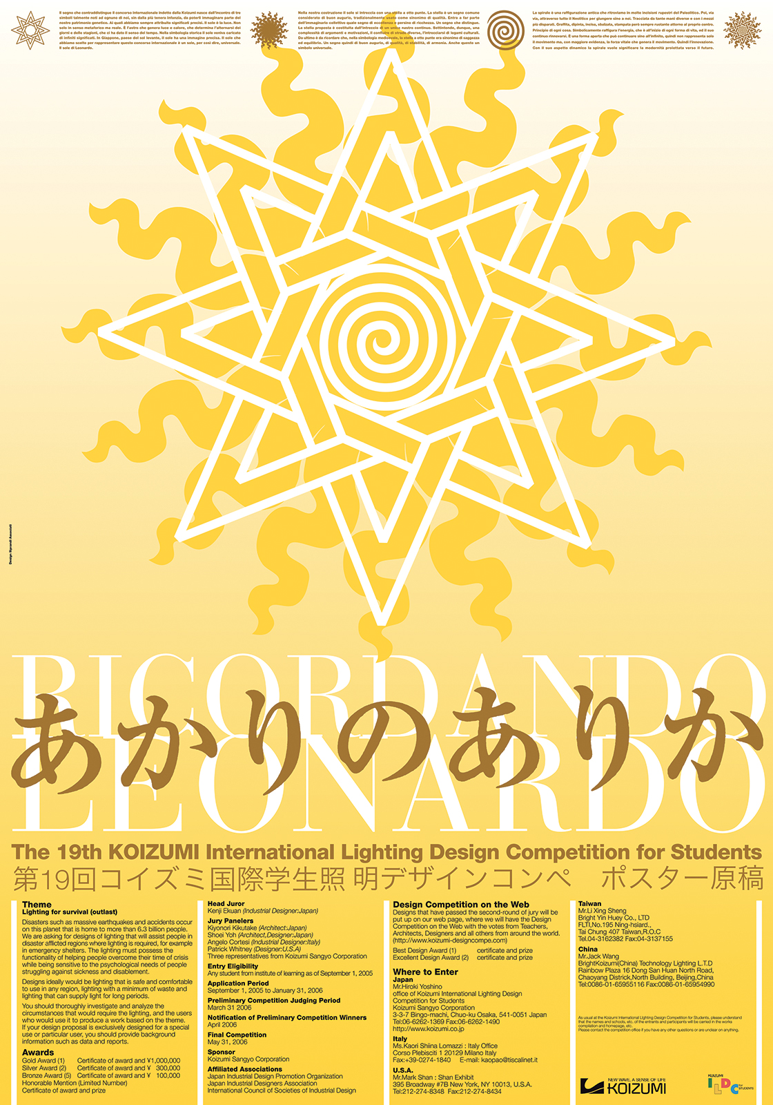 Il manifesto per Koizumi mi è stato chiesto da Angelo Cortesi. Racchiude una complessa serie di simboli la cui descrizione occuperebbe almeno una pagina e il cui significato spero sia stato compreso, a suo tempo, dagli amici giapponesi. Tra i simboli riconosciamo il sole di Leonardo, la stella legata alla magia dei segni e la spirale quale elemento dinamico. La scritta ricordante il Da Vinci è stata composta in Bodoni, forse il carattere romano maggiormente apprezzato dai giapponesi.