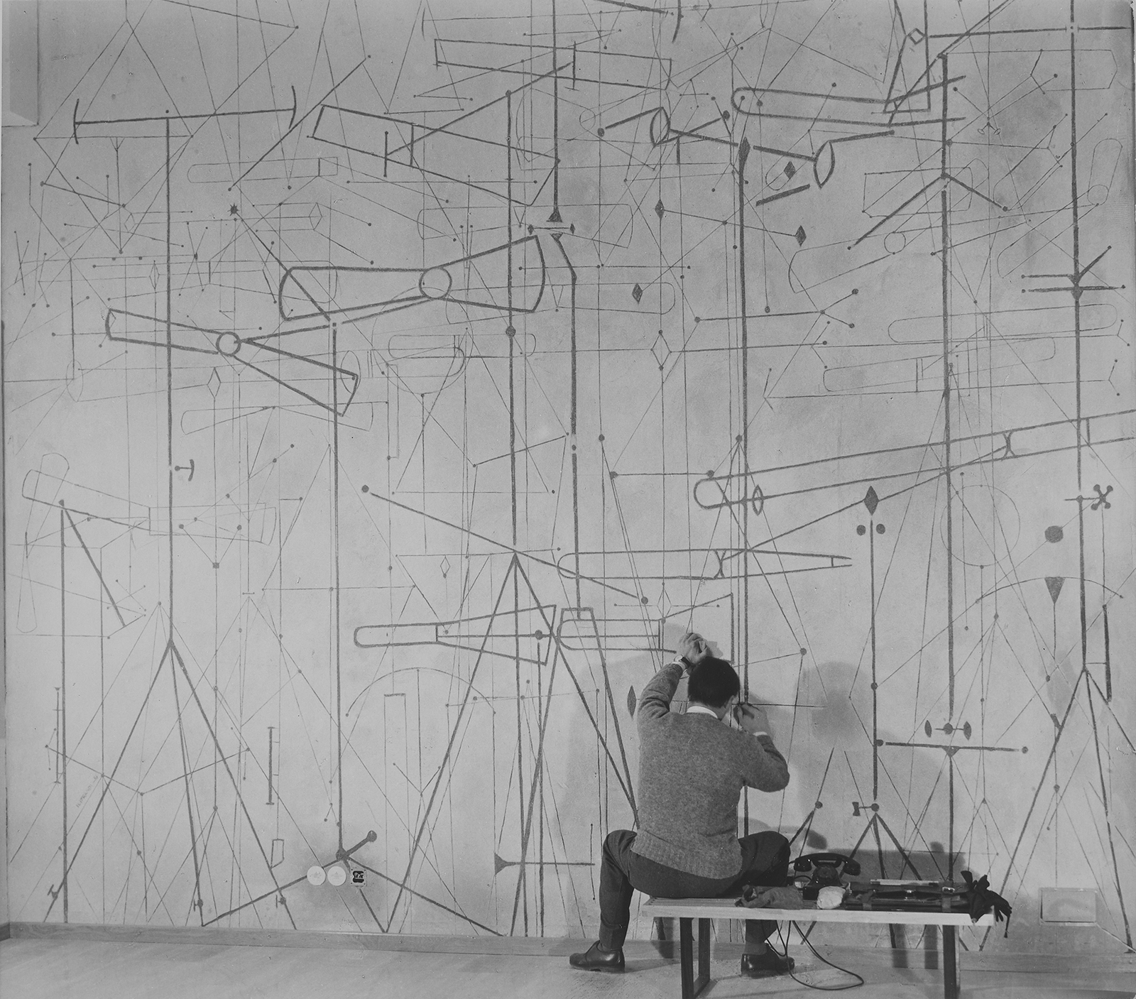 Un bosco di antenne graffite nella parete di un negozio Phonola,