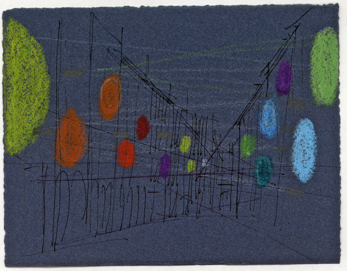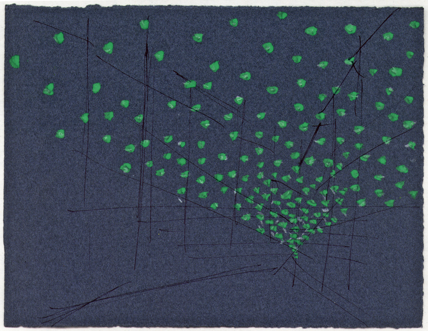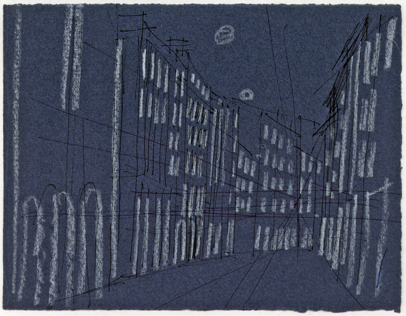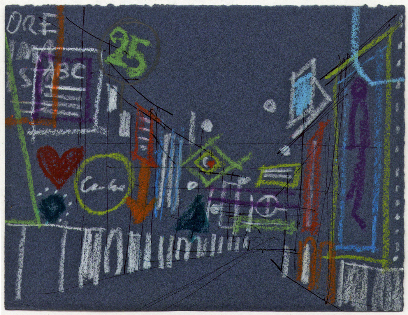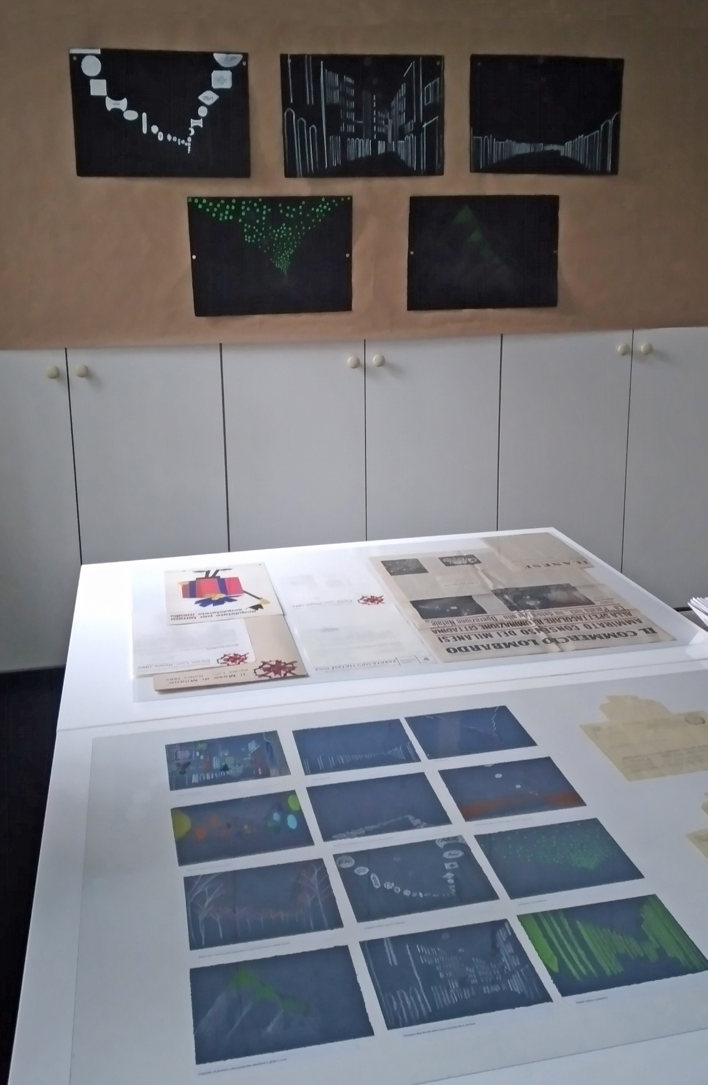 In studio sono conservati, documenti cartacei, articoli di giornale e una serie di bozzetti 17×13 su cartoncino blu e matite colorate,